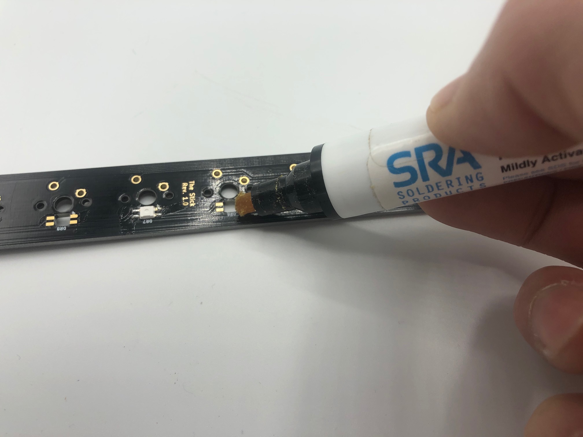 Tin one of the pads of the RGB LED slot. Don't pick the one with the white triangle above it, since that is the GND pad which requires a bit more heat to solder, so you'll have an easier time if to select one of the other three pins to do first.